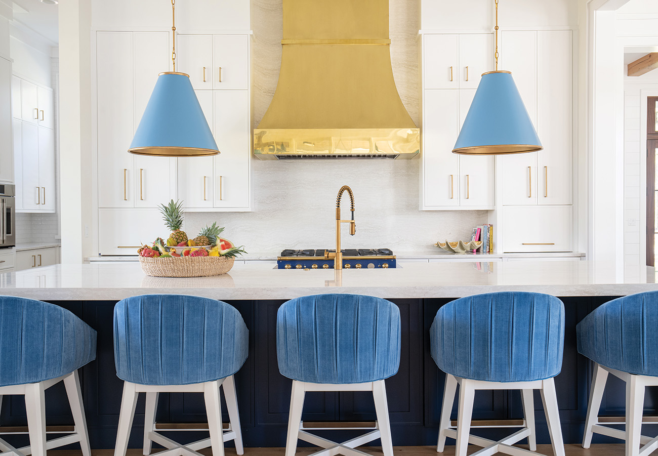 The orientation of the kitchen allowed Neely to make it the brightest star in the show, layering in a dramatic cascade of blues that flows from the royal blue of the CornuFé range into the cornflower sconces and sky blue seats. Because it’s not immediately visible upon entry, these tones are revealed as a crescendo to the more subdued tones in the great room.