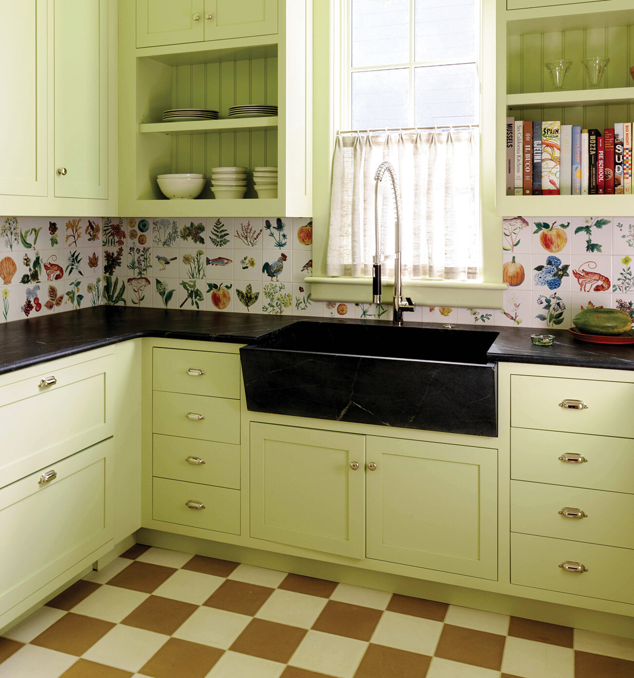 “We wanted the kitchen to be bright and poppy, so when you stand looking at it, there are two doorways and each has its own color,” she said. “We have a light blue in the laundry room and owner’s entry, and in the back kitchen, it’s more melon. It’s a fascinating color because sometimes it’s yellow, sometimes it’s leaf green, and sometimes it looks more citron. It looks different in different light. I think it’s fun to be playful in small, back-of-house places.”